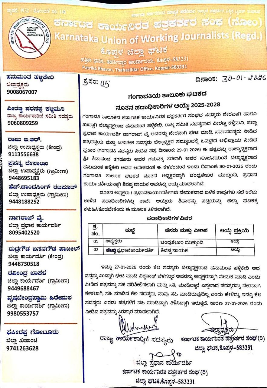 ಕರ್ನಾಟಕ ಕಾರ್ಯನಿರತ ಪತ್ರಕರ್ತರ ಸಂಘಕ್ಕೆ ನೂತನ ಅಧ್ಯಕ್ಷರಾಗಿ ಪತ್ರಕರ್ತ ಚಂದ್ರಶೇಖರ್ ಮುಕ್ಕುಂದಿ ಆಯ್ಕೆ